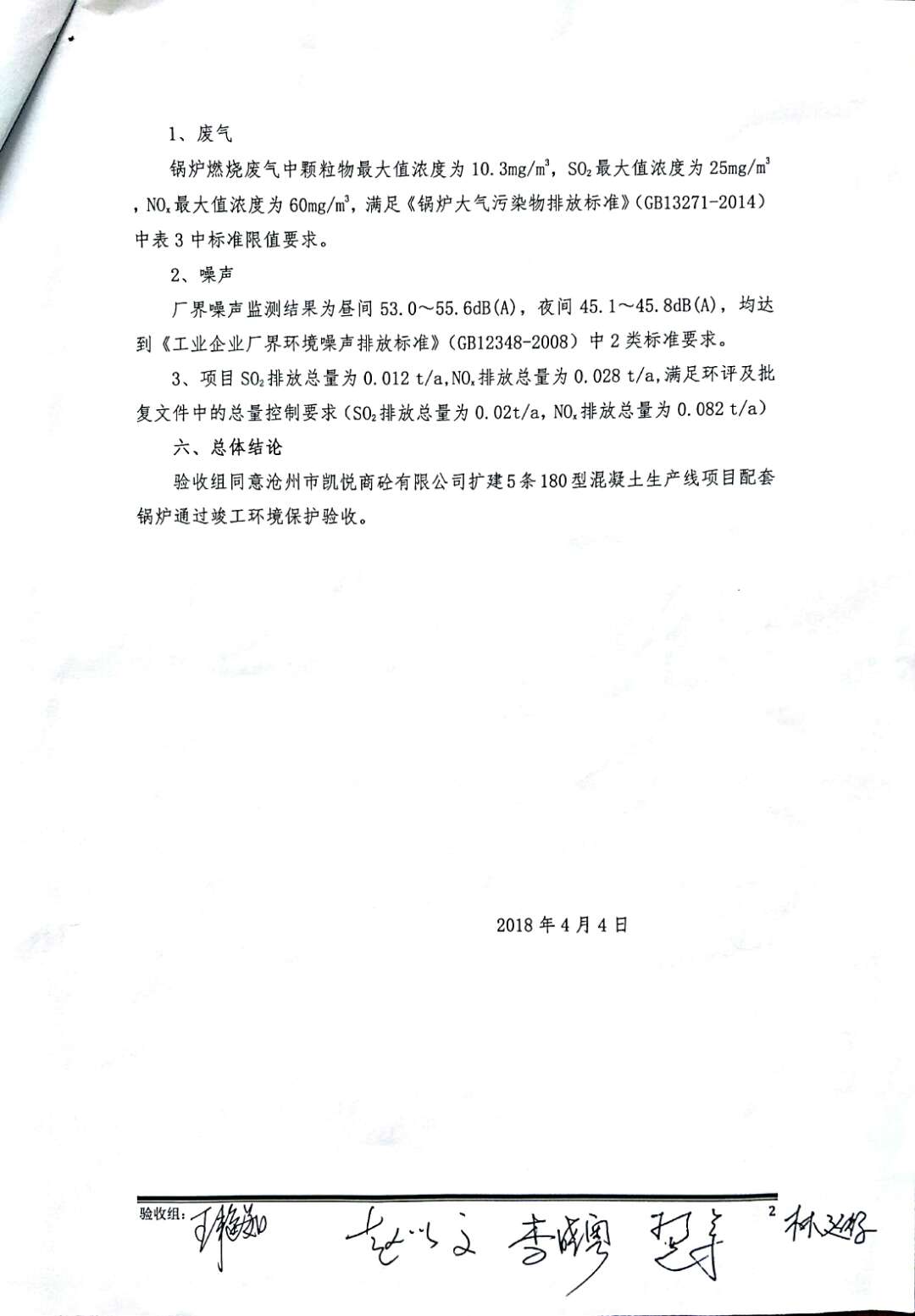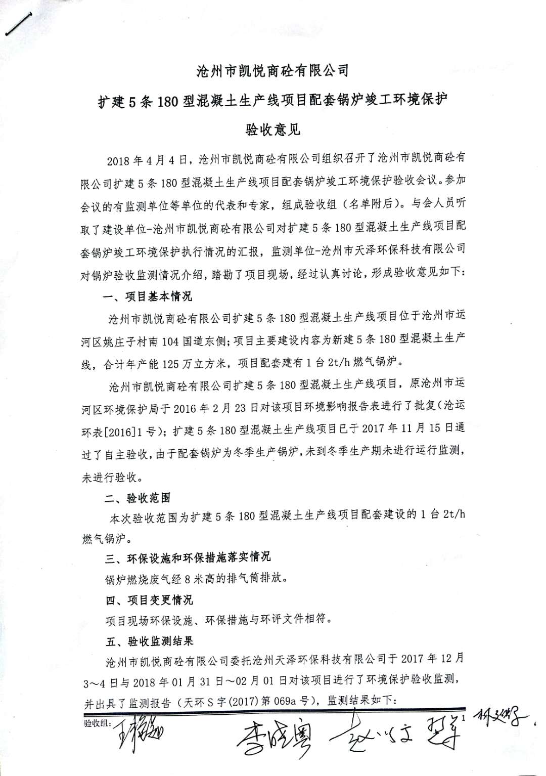 根據(jù)2017年10月1日開(kāi)始實(shí)施的《建設(shè)項(xiàng)目環(huán)境保護(hù)管理?xiàng)l例》的相關(guān)規(guī)定,2017年11月15日滄州市凱悅商砼有限公司組織召開(kāi)了《擴(kuò)建5條180型混凝土生產(chǎn)線項(xiàng)目配套鍋爐竣工環(huán)境保護(hù)驗(yàn)收》技術(shù)評(píng)估會(huì),滄州市運(yùn)河區(qū)環(huán)境保護(hù)局、環(huán)評(píng)編制單位、環(huán)境監(jiān)測(cè)單位、施工單位及特邀專家組成。驗(yàn)收組對(duì)項(xiàng)目進(jìn)行了實(shí)地查看,檢查了項(xiàng)目環(huán)境建設(shè)和運(yùn)行情況,聽(tīng)取了各單位對(duì)該項(xiàng)目的竣工驗(yàn)收?qǐng)?bào)告,在充分討論后認(rèn)為本項(xiàng)目在建設(shè)過(guò)程中基本執(zhí)行了國(guó)家建設(shè)項(xiàng)目環(huán)境管理制度以及“環(huán)保設(shè)施與主題工程同時(shí)設(shè)計(jì)、同時(shí)施工、同時(shí)投產(chǎn)使用”的規(guī);建設(shè)單位落實(shí)了環(huán)評(píng)報(bào)告及其批復(fù)要求的環(huán)境影響治理措施,減緩了項(xiàng)目建設(shè)運(yùn)營(yíng)中的主要負(fù)面環(huán)境影響,同意通過(guò)竣工環(huán)境保護(hù)驗(yàn)收。